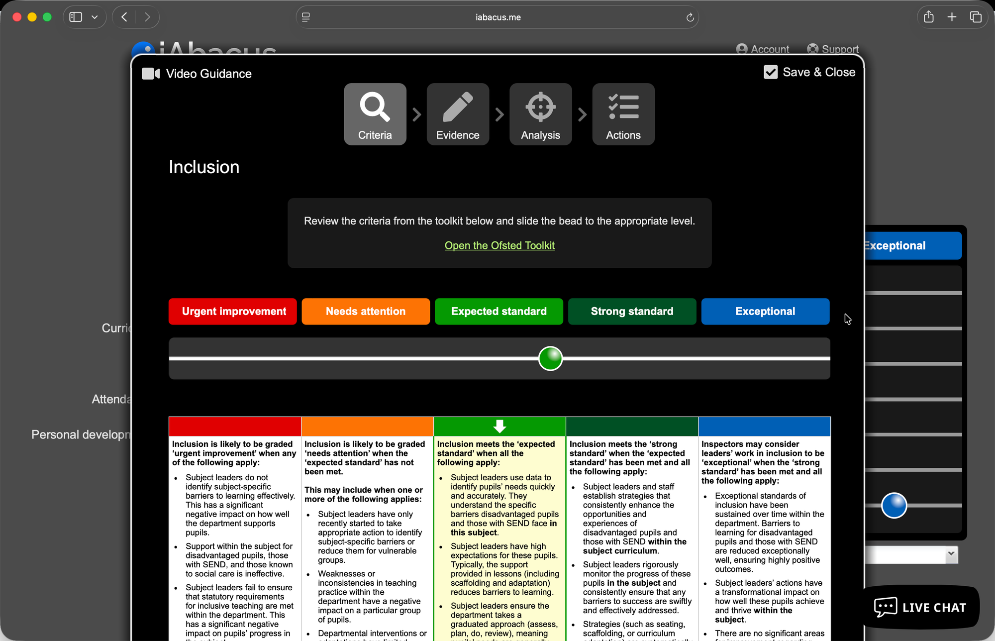 - Uses Ofsted’s evaluation areas and standards